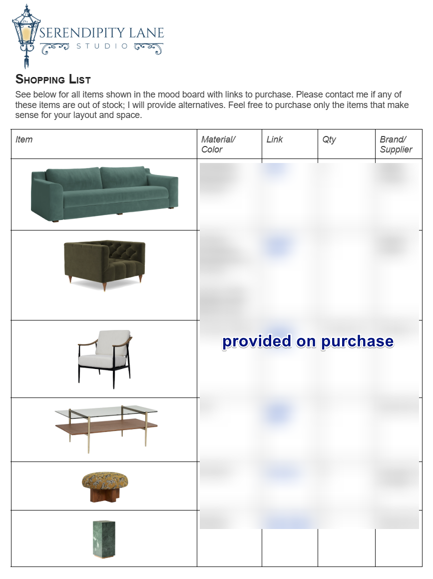 - A shopping list with the furniture and decor used in the design board, shoppable links, and descriptions of the products - all from reliable, high-end retailers.