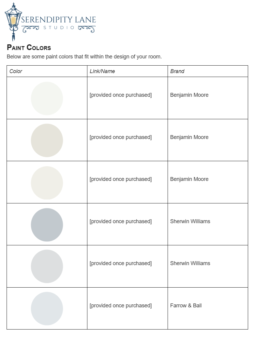 - A list of paint colors from paint brands that suits the design with shoppable links.