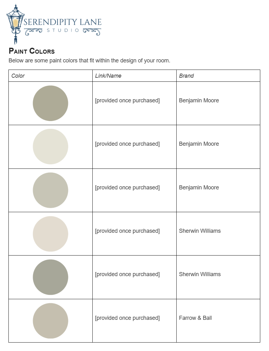 - A list of paint colors from paint brands that suits the design with shoppable links.