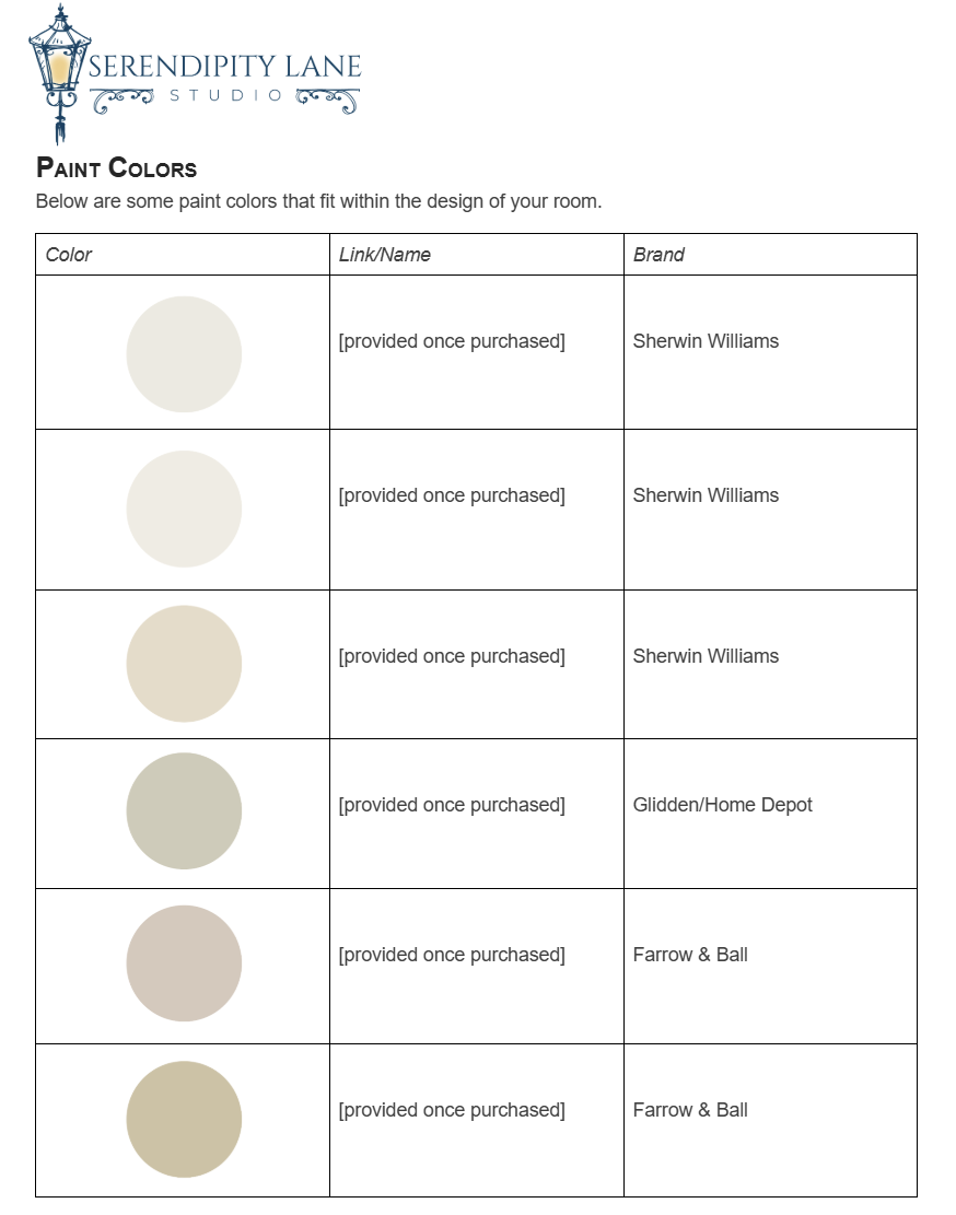 - A list of paint colors from paint brands that suits the design with shoppable links.