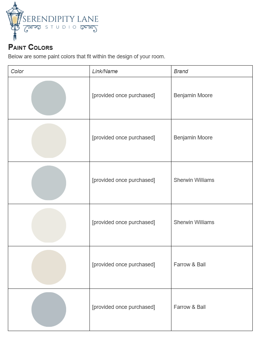 - A list of paint colors from paint brands that suits the design with shoppable links.