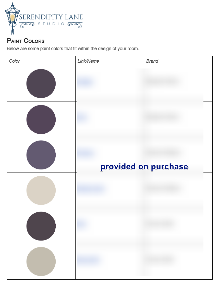 - A list of paint colors from paint brands that suits the design with shoppable links.