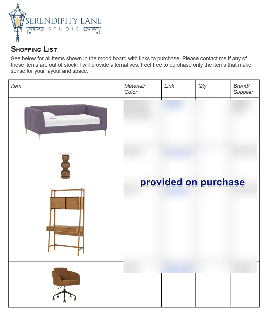 - A shopping list with the furniture and decor used in the design board, shoppable links, and descriptions of the products - all from reliable, high-end retailers.