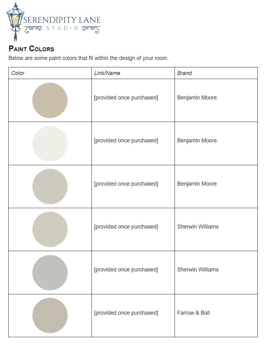 - A list of paint colors from paint brands that suits the design with shoppable links.
