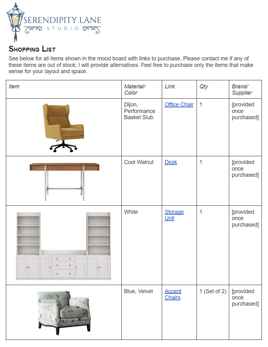 - A shopping list with the furniture and decor used in the design board, shoppable links, and descriptions of the products - all from reliable, high-end retailers.