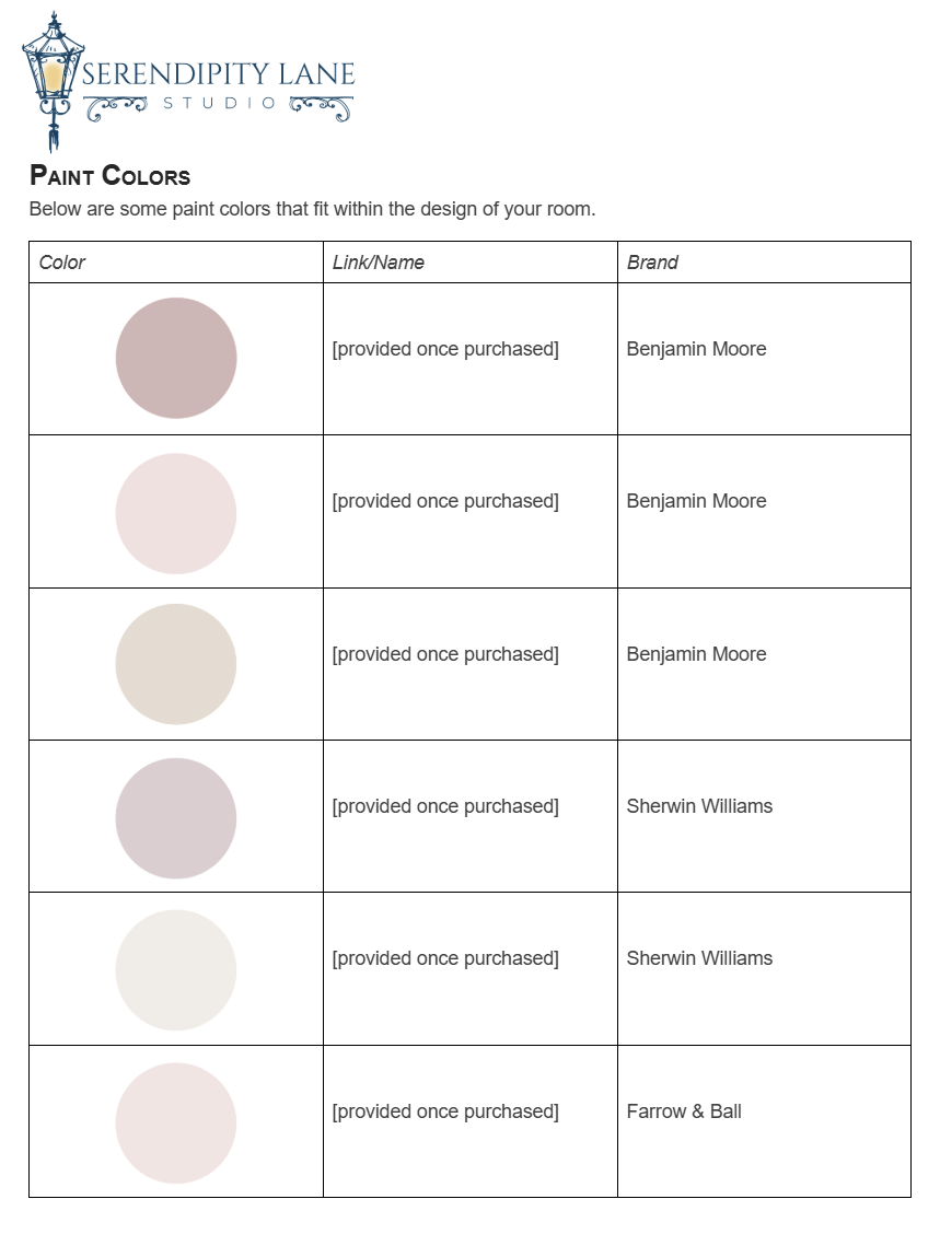 - A list of paint colors from paint brands that suits the design with shoppable links.