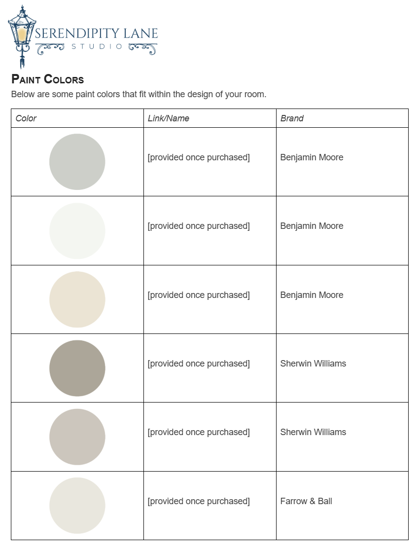 - A list of paint colors from paint brands that suits the design with shoppable links.